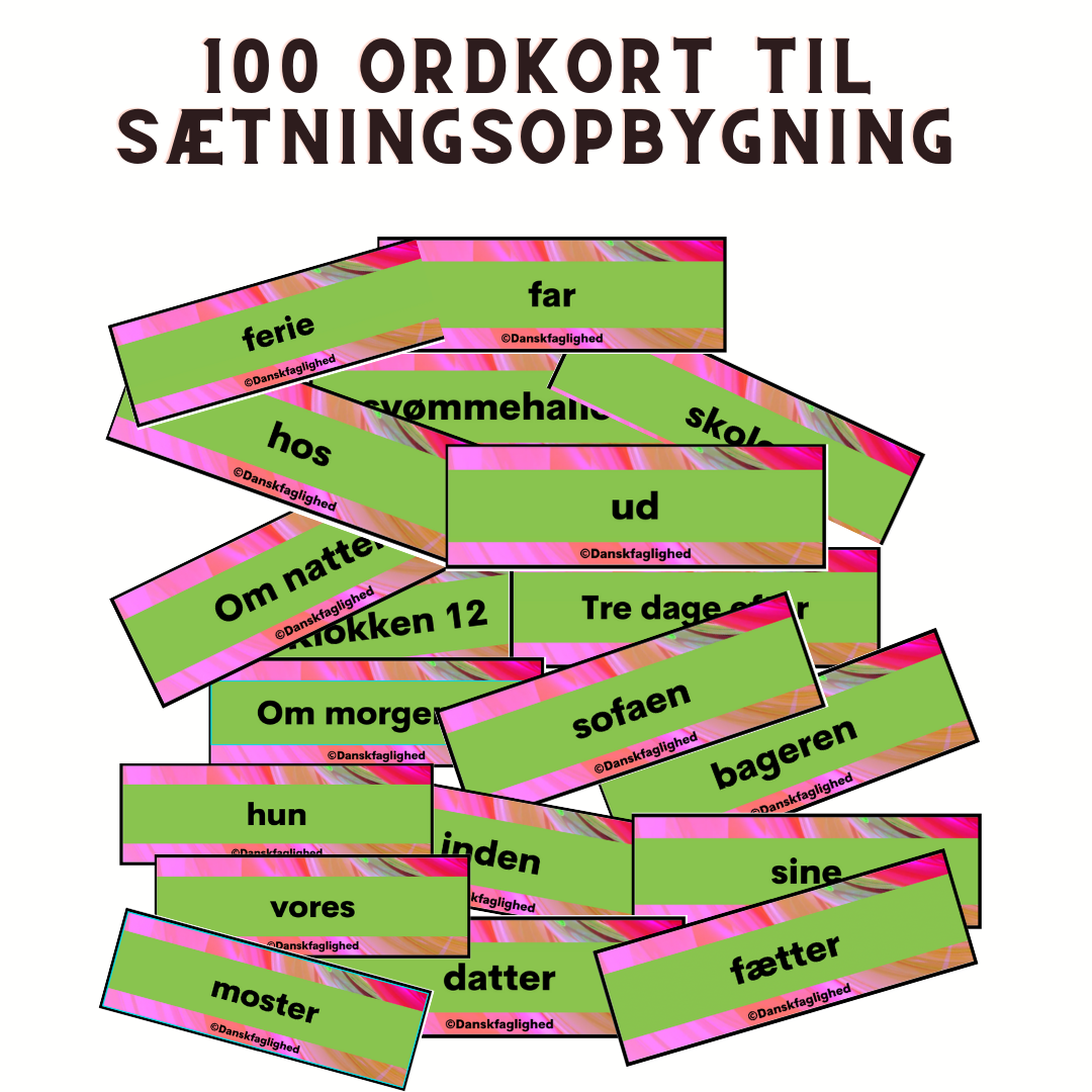 100 ord til sætningsopbygning er et alsidigt og legende materiale med 100 lækre ordkort, der giver eleverne et solidt afsæt til at bygge sætninger, lege med sproget og tale om ordklasser.