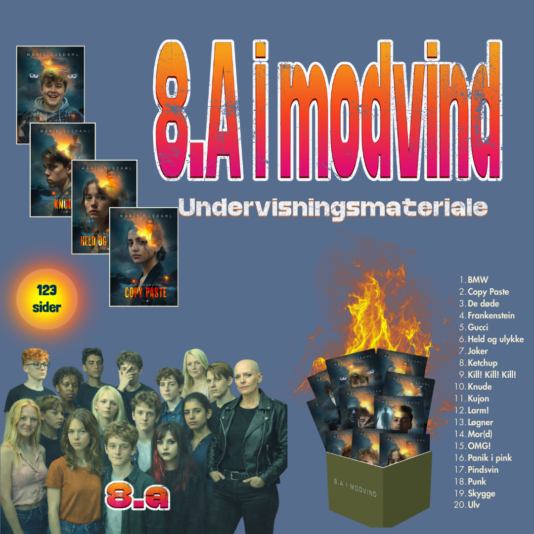 Dette undervisningsmateriale er udviklet til serien 8.A i modvind af Marie Duedahl, der består af 20 korte ungdomsromaner, som tilsammen tegner et nuanceret billede af livet i en 8. klasse.