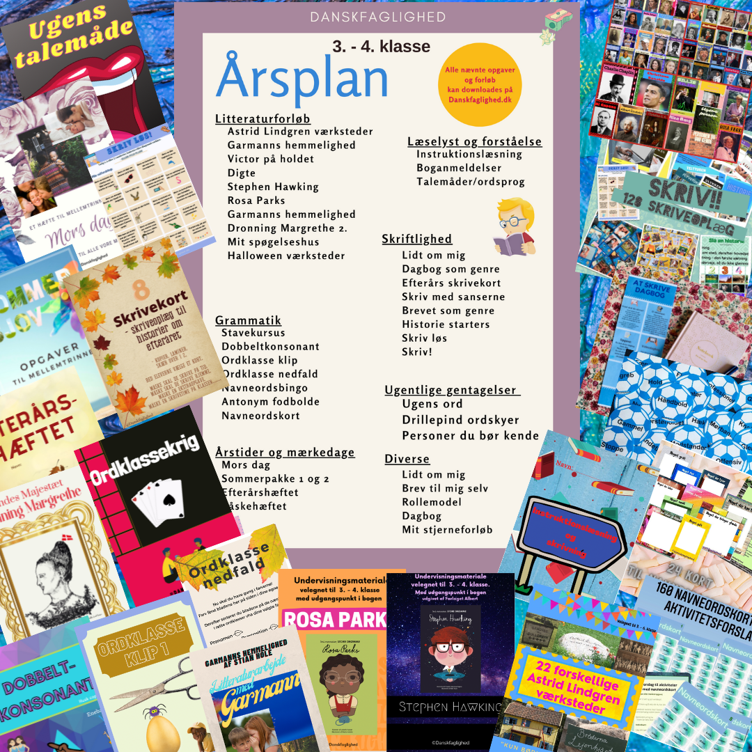 Dette årsforløb i dansk til 3.–4. klasse er en stor, samlet pakke, der dækker hele skoleåret og giver dig ro i planlægningen og overblik i hverdagen. Her er litteratur, grammatik, skriftlighed, faste gentagelser og mærkedage samlet i ét sammenhængende forløb.