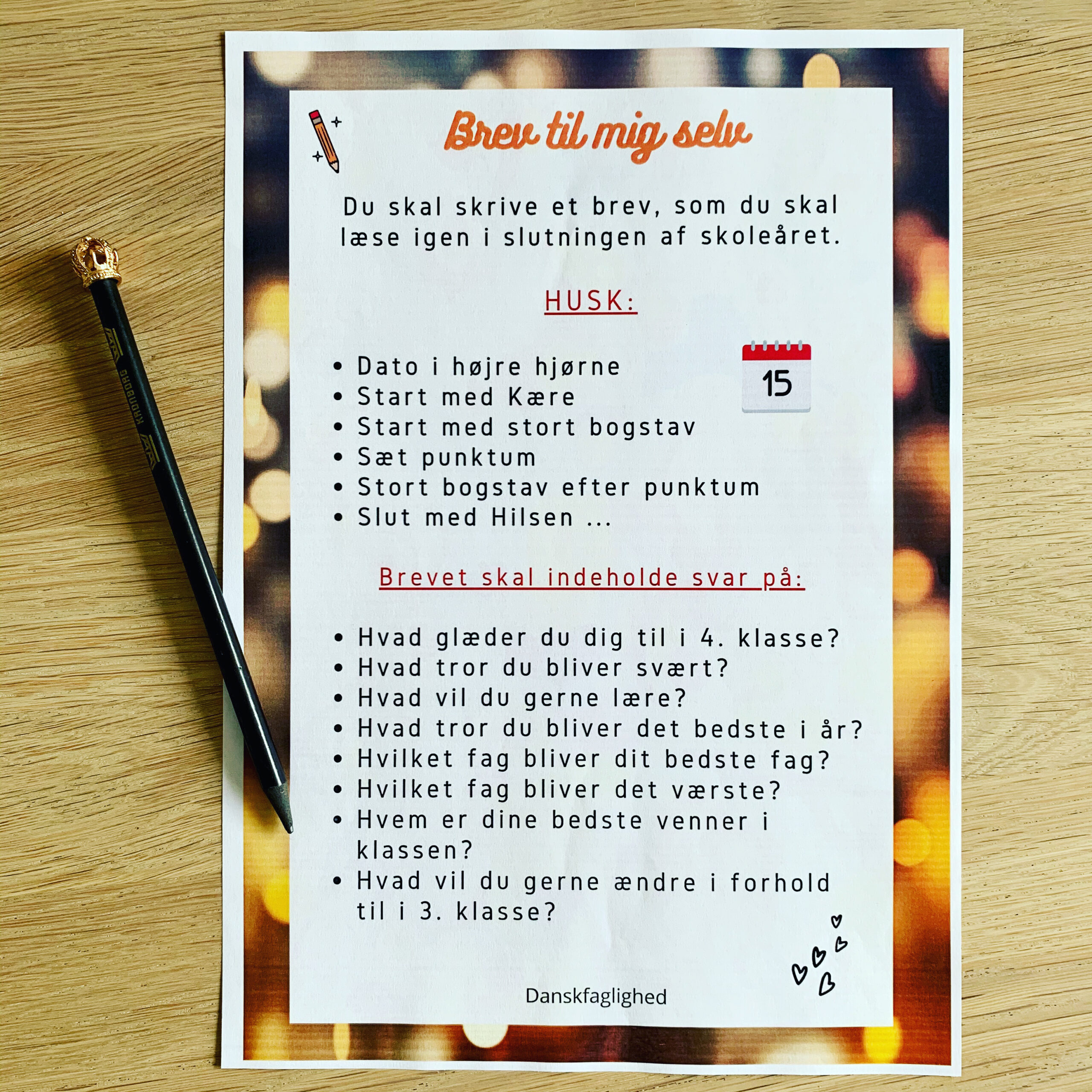 Brev til mig selv er en enkel, men meget virkningsfuld skriveopgave, hvor eleverne skriver et brev til sig selv ved skolestart – og læser det igen ved skoleårets slutning 😉