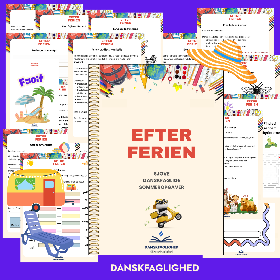 🔹 Opgavetyper: Tegn og fortæl, skriv en sætning, gæt ordet, ret fejl, find det, der ikke passer