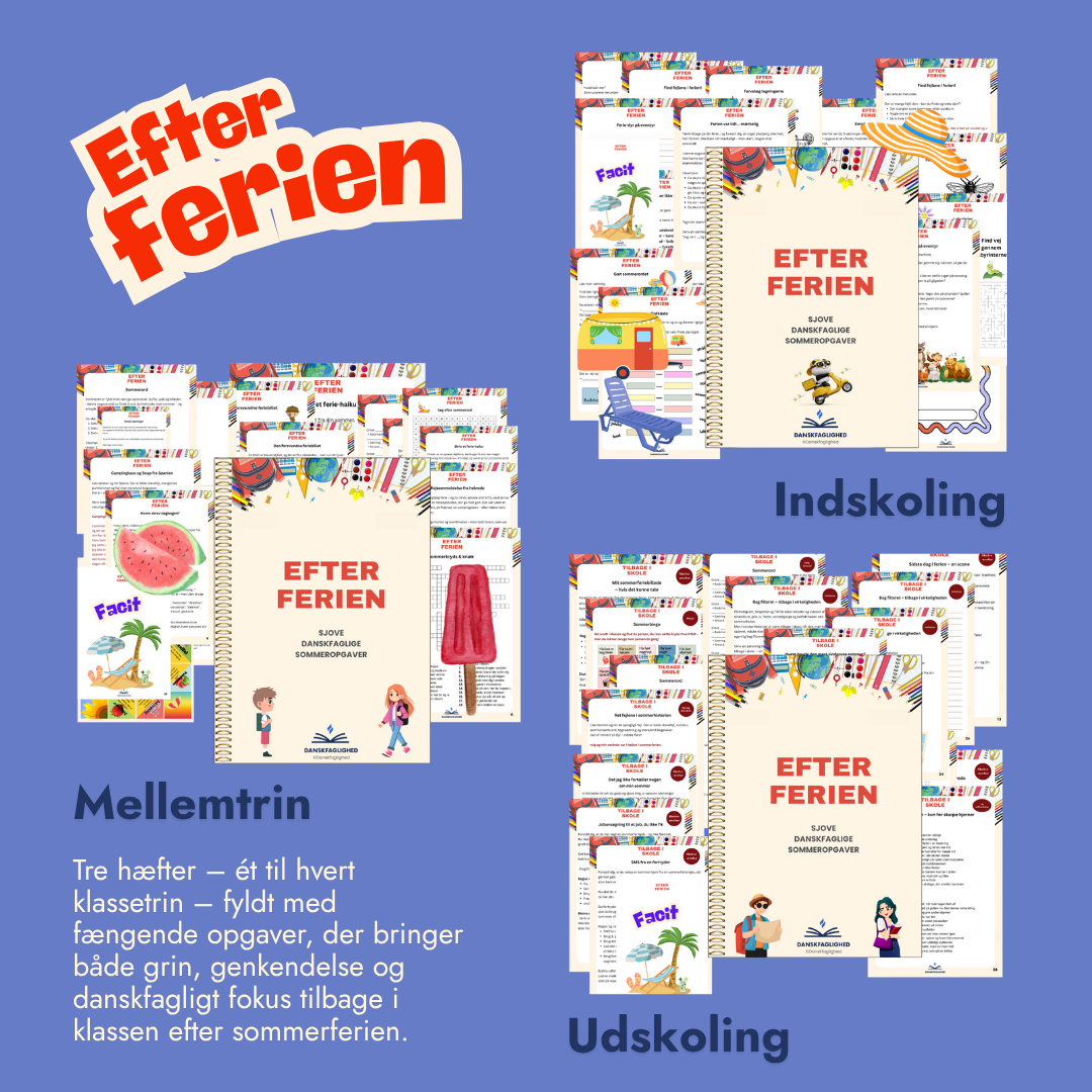 Tre hæfter – ét til hvert klassetrin – fyldt med fængende opgaver, der bringer både grin, genkendelse og danskfagligt fokus tilbage i klassen efter sommerferien.
