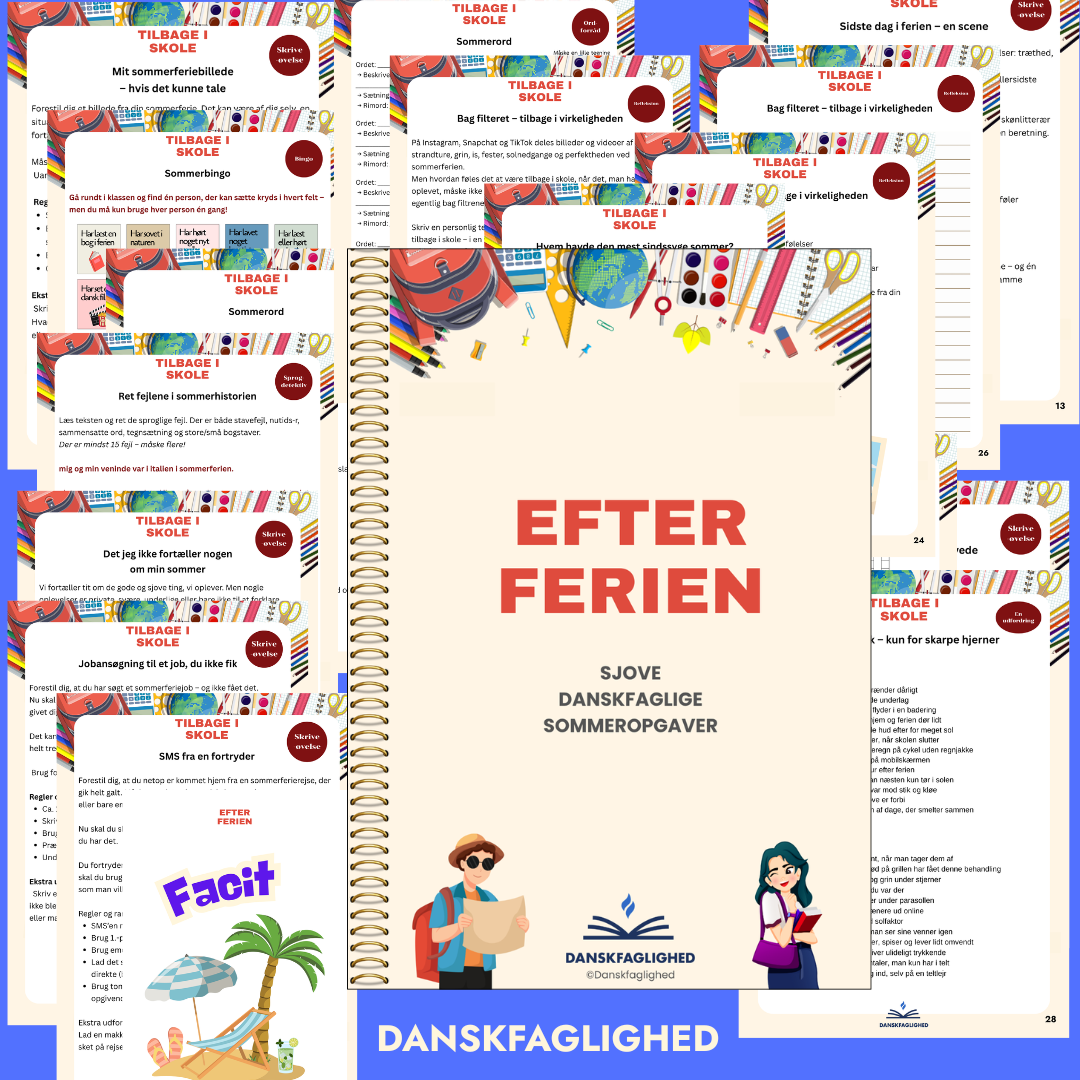 EFTER FERIEN til udskolingen indeholder 30 sider med opgaver, der kredser om sociale medier, identitet, sommerminder, sprog og selviscenesættelse.