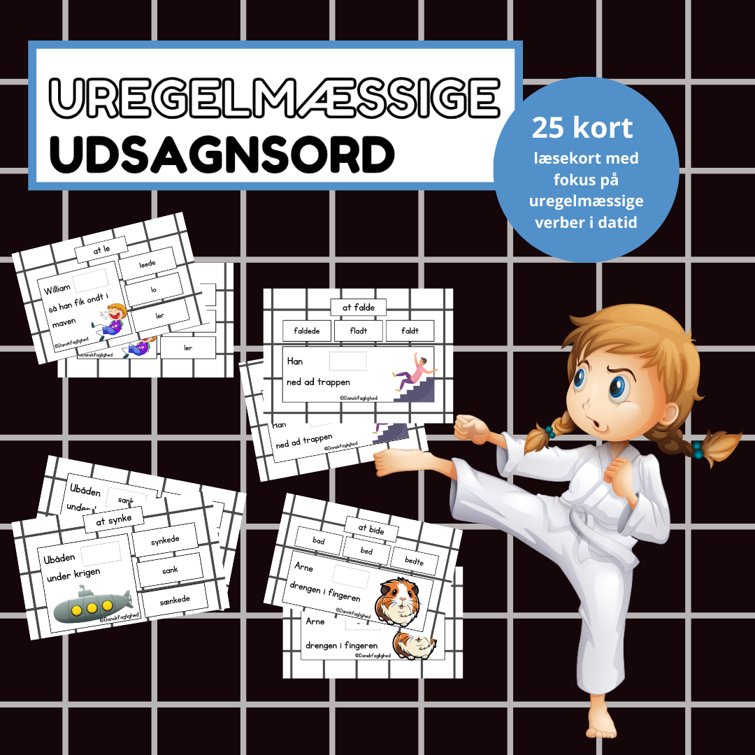 Kopier kortene og laminer dem med for- og bagside. På den ene side af kortet står verbet i infinitiv form, og på den anden side står datidsformen (præteritum) i en rigtig og to forkert udgaver. Børnene kan læse verbet på den ene side, gætte svaret, og derefter tjekke facit på den anden side.