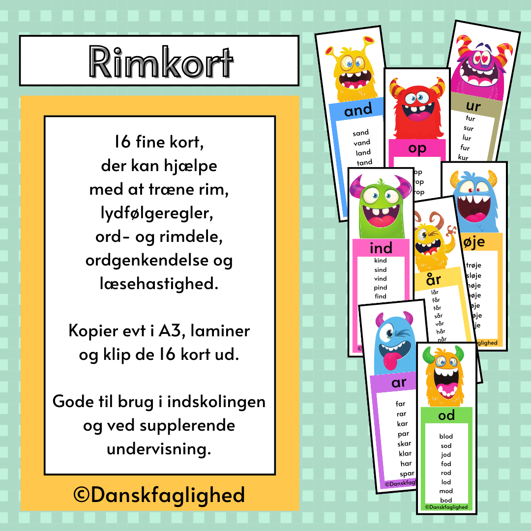 16 fine rimkort, der kan hjælpe med at træne rim, lydfølgeregler, ord- og rimdele, ordgenkendelse og læsehastighed.