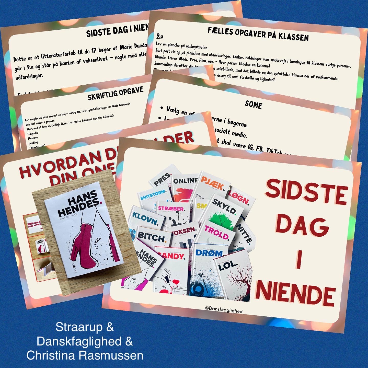 “Sidste dag i niende” af Marie Duedahl er ung læs let, dvs. bøger med et lavt lix. De i alt 17 bøger har samme omdrejningspunkt, men hver sin synsvinkel. Netop de forskellige synsvinkler gør bøgerne oplagt til brug i fx 7. eller 8. Der er meget på spil for eleverne i 9. klasse, hvilket vil være relaterbart for eleverne i undervisningen. Derudover lægger de op til gode samtaler om selvopfattelse, forståelse for andre, deres handle- og reaktionsmønstre.