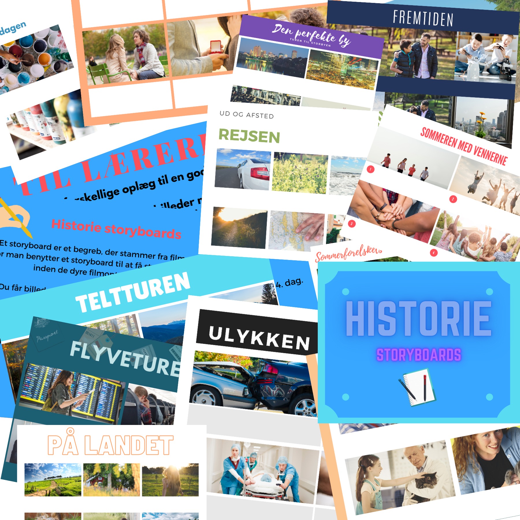 Hvert oplæg består af et storyboard med 4-6 billeder med plads til stikord eller et par skrevne linjer under hvert billede.